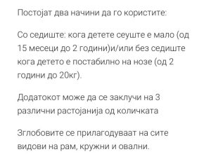 Одлична за патување (прилагодливи тркала за нерамен терен), лесна, компактна, лесно подесување на наслонот, продолжена тенда за заштита од сонце и дожд, четири ПУ тркала со амортизери, лесно закочување, T бариера, прилагодливи сигурносни појаси со 5 точки, корпа.