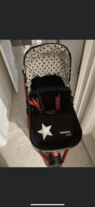 Со неа доаѓаат корпа,траспотер торбица,мрежа за против комарци и навлака за заштита од дожд.Количката е алуминска,многу лесна и лесно се управува со неа,може да се склопи и да се транспортира во најмал гепек од автомобил.Купена е 30.000 а користена е двапати.Цената на количката е 17.000 ден,со можност за договор .